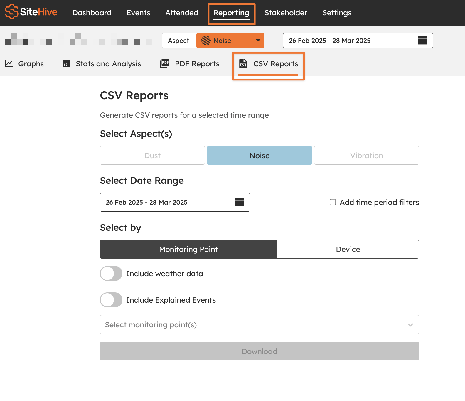 CSV reports in SiteHive allow you to export Noise, Dust, and Vibration event data for detailed analysis. Go to the Reporting / CSV Reports page.