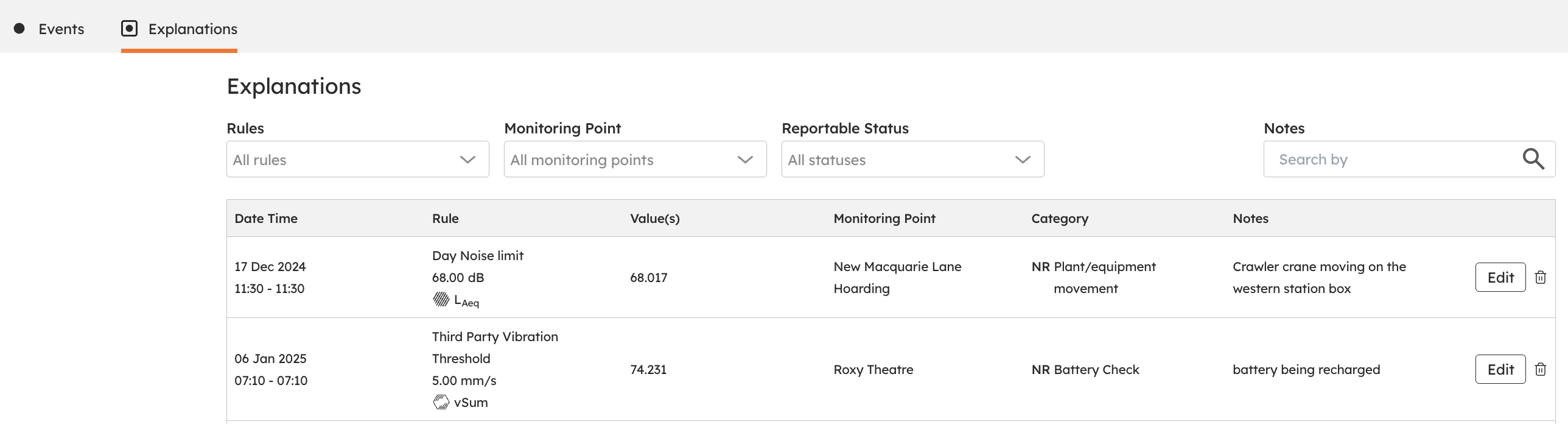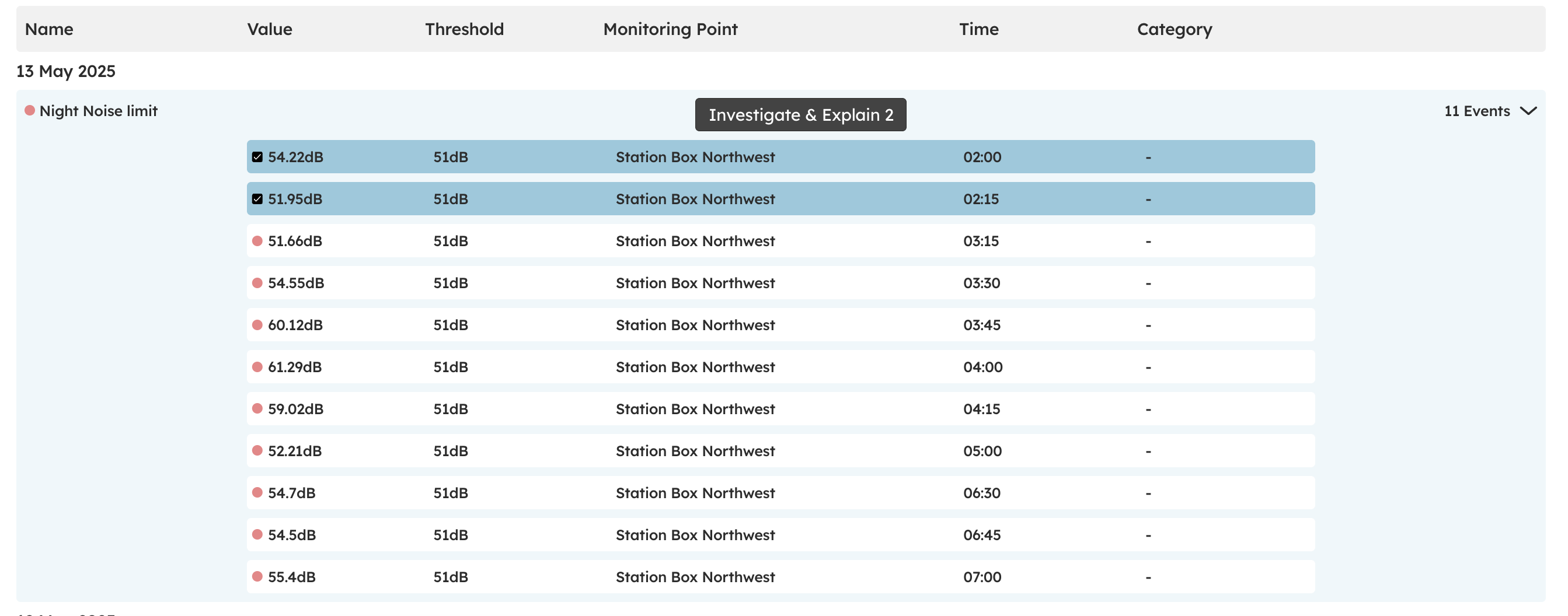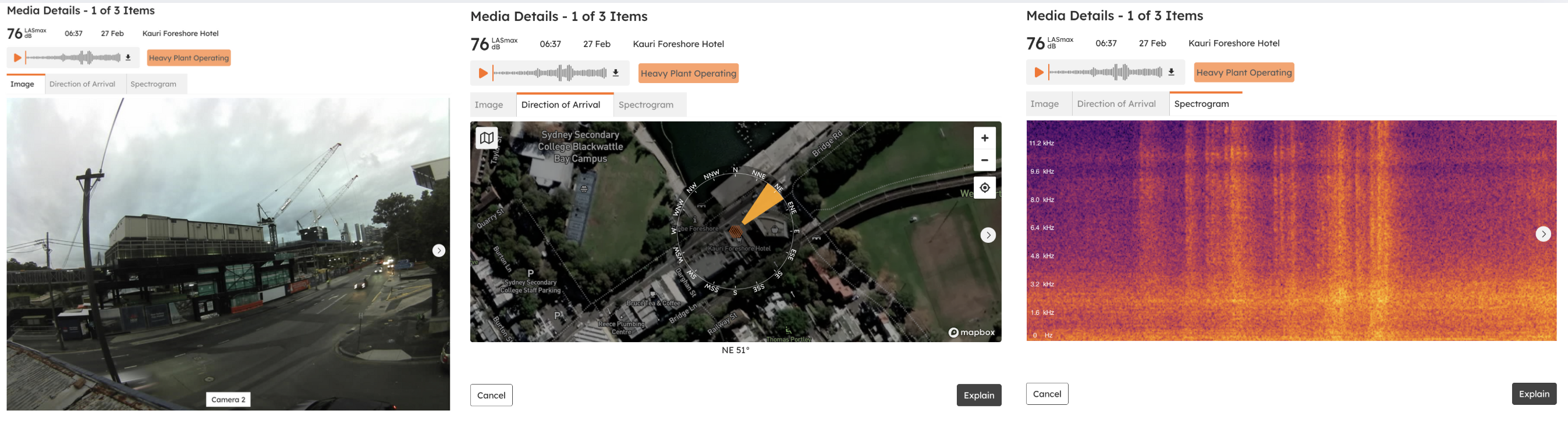 The "Investigate" button gives you quick access to all the context you need for an exceedance, including images, audio, direction of arrival data, spectrograms, and (for vibration exceedances) waveforms. This makes on-site event investigation easier, whether you’re looking at real-time data or preparing month-end reports.