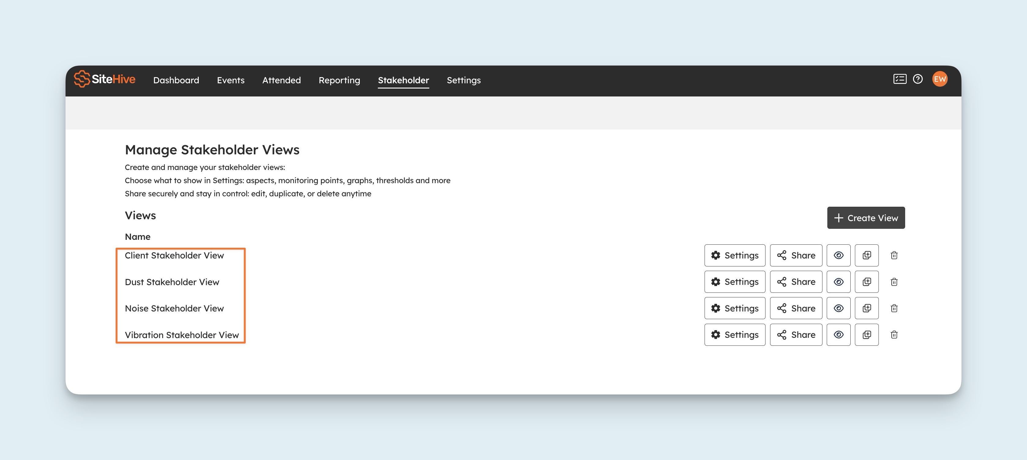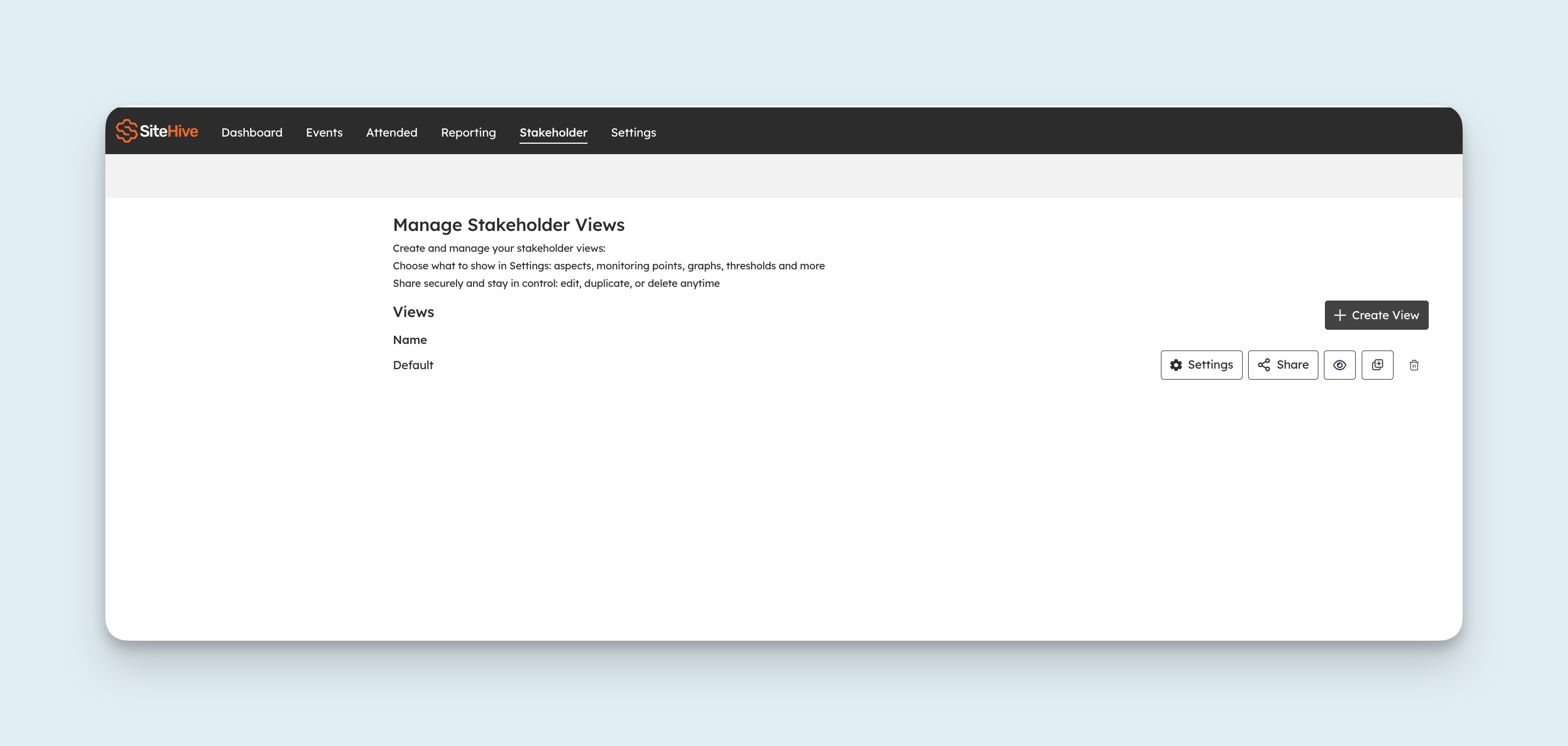 The Stakeholder View is all about transparency. It provides stakeholders with a simple, high-level overview of your site's environmental activity, without requiring them to access the full SiteHive software.