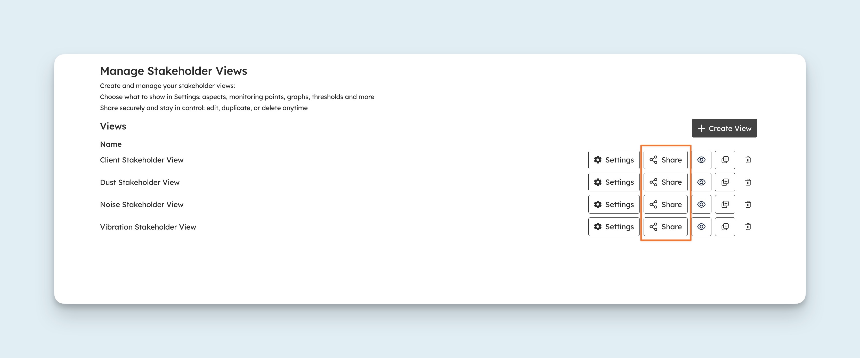 To share the Stakeholder View, simply press the Share button next to the view you want to share.